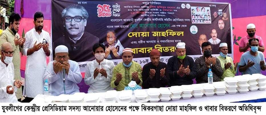 যথাযোগ্য মর্যাদায় বাঙ্গালী জাতির পিতা বঙ্গবন্ধু শেখ মুজিবুর রহমানের ৪৬ তম শাহাদৎ বার্ষিকী উপলক্ষে বাংলাদেশ আওয়ামী যুবলীগের কেন্দ্রীয় কমিটির প্রেসিডিয়াম সদস্য ও ঝিকরগাছা উপজেলার কৃতি সন্তান মোঃ আনোয়ার হোসেন এর পক্ষ থেকে ঝিকরগাছা বাসস্ট্যান্ডে সোমবার সকাল ১১টার সময় দোয়া মাহফিল ও খাবার বিতরণ করা হয়েছে।
