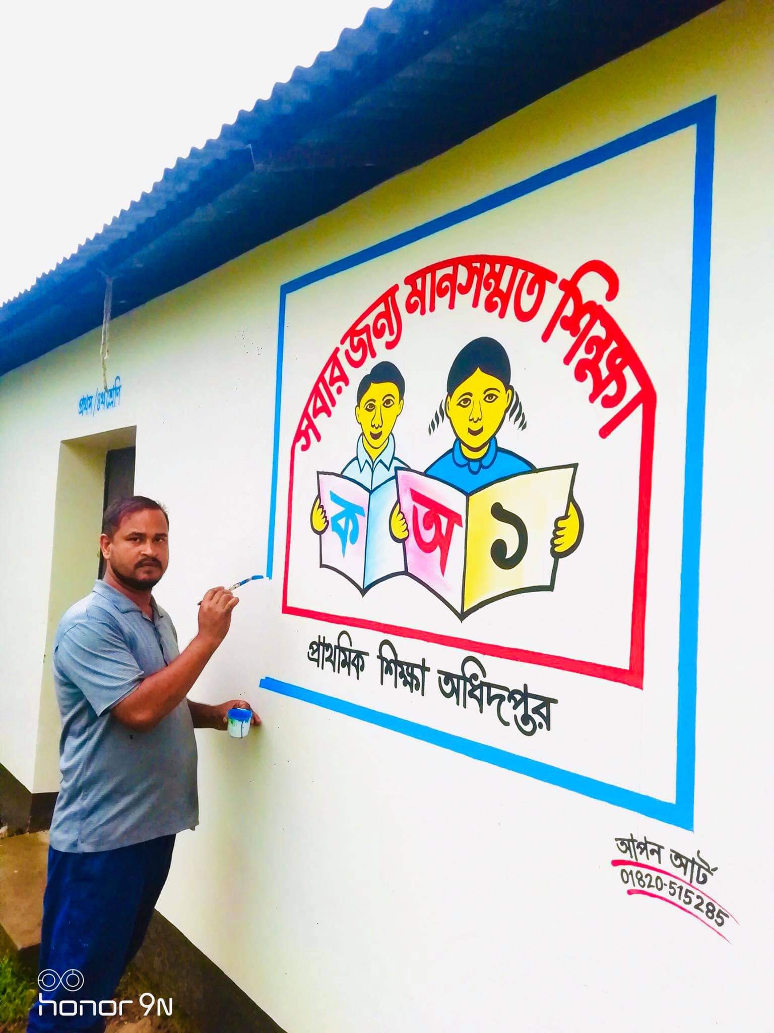 একটি স্কুলের দেয়ালে রংতুলি দিয়ে লিখছেন আর্টিস্ট শিবু পদ দাস(আপন) । একসময় রংতুলির ব্যানার ও সাইনবোর্ড লিখতেন তিনি। পরে অন্য ব্যানার লেখার কাজ শুরু করেছিলেন। অর্ডারও আসতো অনেক। কিন্তু এখন ব্যানার বা সাইনবোর্ড আর হাতে লেখার খুব একটা সুযোগ মেলে না তার। ১২ বছরের অভ্যাসবশত দোকান বসেন আর মাঝে মধ্যে অর্ডার পেলে রংতুলি হাতে নিয়ে ব্যানার লেখার কাজ করেন। সাথে রোজগারের জন্যে শুরু করেছেন প্রিন্টের কাজ।