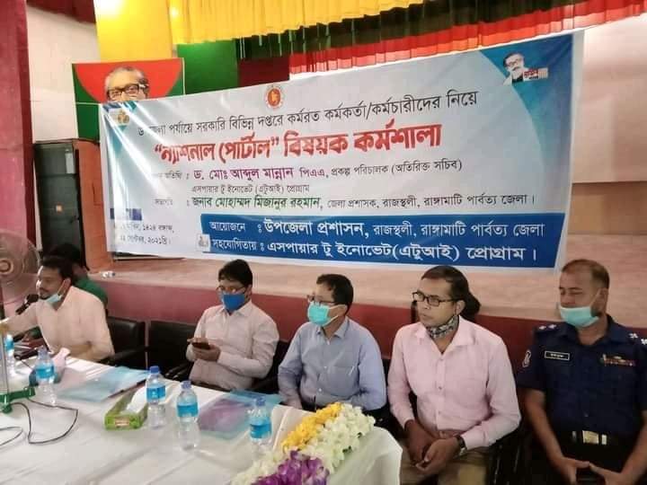 রাঙামাটি জেলার রাজস্থলী উপজেলা পর্যায়ে বিভিন্ন সরকারি দপ্তরের কর্মকর্তা কর্মচারীদের নিয়ে এক দিন ব্যাপী( ২২ ইং সেপ্টেম্বর ২০২১) সকাল ১০ টায় বুধবার রাজস্থলী উপজেলা পরিষদ হল রুমে ন্যাশনাল র্পোটাল বিষয়ক কর্মশালায় সভাতে রাঙ্গামাটি জেলা প্রশাসক মোঃ মিজানুর রহমান এর সভাপতিত্বে প্রধান অতিথি হিসেবে ভার্চুয়ালি যুক্ত হয়ে বক্তব্য রাখেন ডঃ দেওয়ান মোহাম্মদ হুমায়ন কবীর, প্রকল্প পরিচালক এটু আই। এর পর রাজস্থলী উপজেলা নির্বাহী কর্মকর্তা শেখ ছাদেকের সঞ্চালনায় ১ দিন ব্যাপী ন্যাশনাল পোর্টাল বিষয়ক কর্মশালায় প্রশিক্ষক হিসেবে উপস্থিত ছিলেন সহকারী প্রোগ্রামার এটু আই প্রকল্পের শ্যাম ঘোষ । এর সাথে অন্যানের মধ্যে উপস্থিত ছিলেন,বিপুল বনিক সহকারী প্রোগ্রামার সদর রাঙ্গামাটি।দিনব্যাপী কর্মশালায় বিভিন্ন সরকারি দপ্তরের কর্মকর্তা কর্মচারীগণ অংশগ্রহণ করেন।