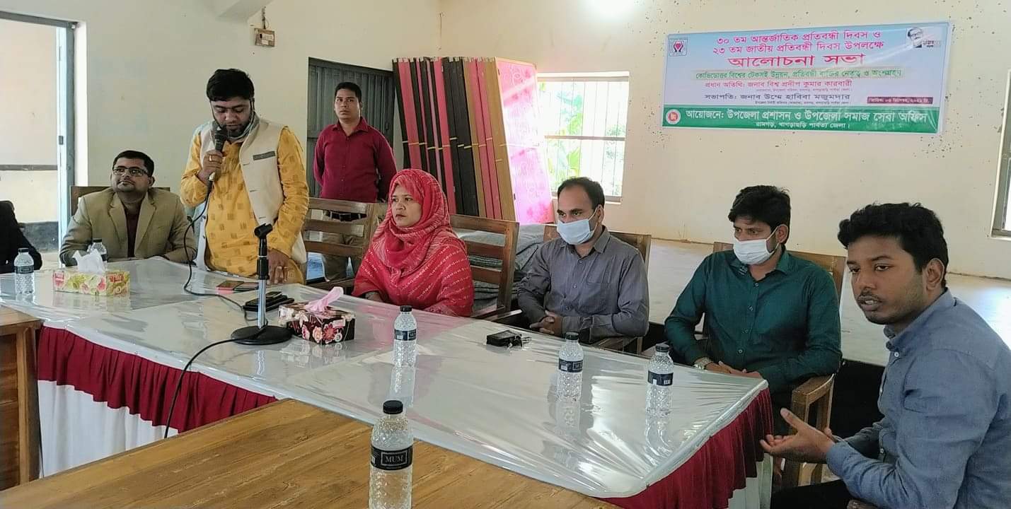 রামগড় উপজেলা প্রশাসন ও সমাজ সেবা কার্যালয় দিবসটি যথাযোগ্য মর্যাদায় পালন উপলক্ষে শুক্রবার( ৩ ডিসেম্বর)সকাল এগারোটায় উপজেলা সম্মেলন কক্ষে আলোচনা সভা,প্রতিবন্ধীদের মাঝে ভাতা বই ও কম্বল বিতরণের আয়োজন করে। সমাজ সেবা কর্মকর্তা আজিজুর রহমান আনজুমের সঞ্চালনায় এতে সভাপতিত্ব করেন রামগড় উপজেলা নির্বাহী কর্মকর্তা (ভারপ্রাপ্ত) উম্মে হাবিবা মজুমদার।আলোচনা সভায় বক্তব্য রাখেন রামগড় উপজেলা মৎস্য কর্মকর্তা বিজয় কুমার দাশ, প্রকল্প বাস্তবায়ন কর্মকর্তা মোঃ মনসুর আলী প্রমূখ।সভায় বক্তারা গণপ্রজাতন্ত্রী বাংলাদেশ সরকারের জনকল্যাণমুখী কর্মকান্ডে অংশ নিয়ে সুন্দরভাবে জীবনযাপনের জন্য প্রতিবন্ধীদের সরকারি সেবার আওতায় আসার আহবান জানান।প্রতিবন্ধীদের চিকিৎসা সহায়তা,ঔষধ ও আশ্রয়ণ প্রকল্পের আওতায় ঘর পাওয়ার জন্য উপজেলা প্রশাসন ও সমাজ সেবা কার্যালয়ে আবেদন করতে পরামর্শ দেওয়া হয়েছে।