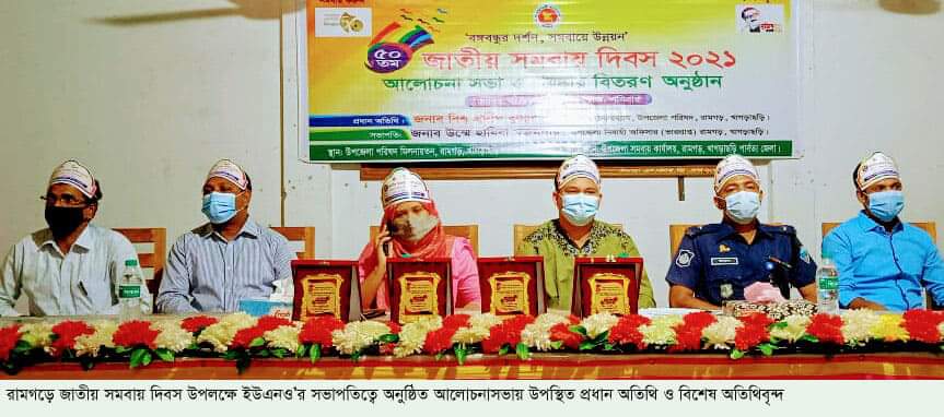 "বঙ্গবন্ধুর দর্শন,সমবায়ে উন্নয়ন "এই প্রতিপাদ্য নিয়ে খাগড়াছড়ির রামগড়ে পালিত হয়েছে ৫০তম জাতীয় সমবায় দিবস।শনিবার উপজেলা সমবায় অফিস আঙ্গিনায় আনুষ্ঠানিকভাবে জাতীয় ও বিভাগীয় পতাকা উত্তোলনের মাধ্যমে দিবসের বিভিন্ন কর্মসূচির উদ্বোধন করা হয়।পরে উপজেলা নির্বাহি কর্মকর্তা (ভারপ্রাপ্ত) উম্মে হাবিবা মজুমদারের সভাপতিত্বে সম্মেলন কক্ষে এ উপলক্ষে এক আলোচনাসভা অনুষ্ঠিত হয়। এতে প্রধান অতিথির বক্তব্য দেন উপজেলা চেয়ারম্যান বিশ্ব প্রদীপ কুমার কার্বারি। বিশেষ অতিথি ছিলেন, উপজেলা ভাইস চেয়ারম্যান আনোয়ার ফারুক, রামগড় পৌরসভার নবনির্বাচিত মেয়র মো: রফিকুল আলম কামাল,থানার ভারপ্রপ্ত কর্মকর্তা(ওসি) মোহাম্মদ সামশুজ্জামান। আলোচনাসভায় স্বাগত বক্তব্য দেন উপজেলা সমবায় অফিসার মোঃ দিদারুল ইসলাম।অন্যান্যের মধ্যে উপজেলা মৎস্য কর্মকর্তা বিজয় কুমার দাশ, উপজেলা পরিবার পরিকল্পনা কর্মকর্তা মাসুদ মানুন, সাবেক ইউপি চেয়ারম্যান মুজিবুর রহমান, সাংবাদিক মো: নিজাম উদ্দিন লাভলু, সমবায়ি তাজুল ইসলাম বক্তব্য রাখেন। সহকারি উপজেলা শিক্ষা অফিসার উম্রাচিং চৌধুরীর সঞ্চালনায় আলোচনাসভা শেষে সফল সমবায় সমিতির নেতৃবৃন্দের মাঝে সন্মাননা ক্রেস্ট ও সনদ বিতরণ করা হয়।
