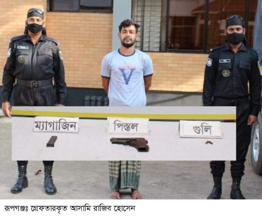 নারায়ণগঞ্জের রূপগঞ্জ উপজেলার তারাবো পৌরসভার বরাবো এলাকা থেকে গত ৩ আগষ্ট মঙ্গলবার রাতে দুই রাউন্ড গুলিভর্তি পিস্তলসহ ডাকাতি মামলার আসামি রাজিব হোসেন ওরফে রাজুকে (২৮) গ্রেফতার করেছে র্যাব-১১। বুধবার সকালে র্যাবের পক্ষ থেকে প্রেস বিজ্ঞপ্তিতে এ তথ্য জানানো হয়।