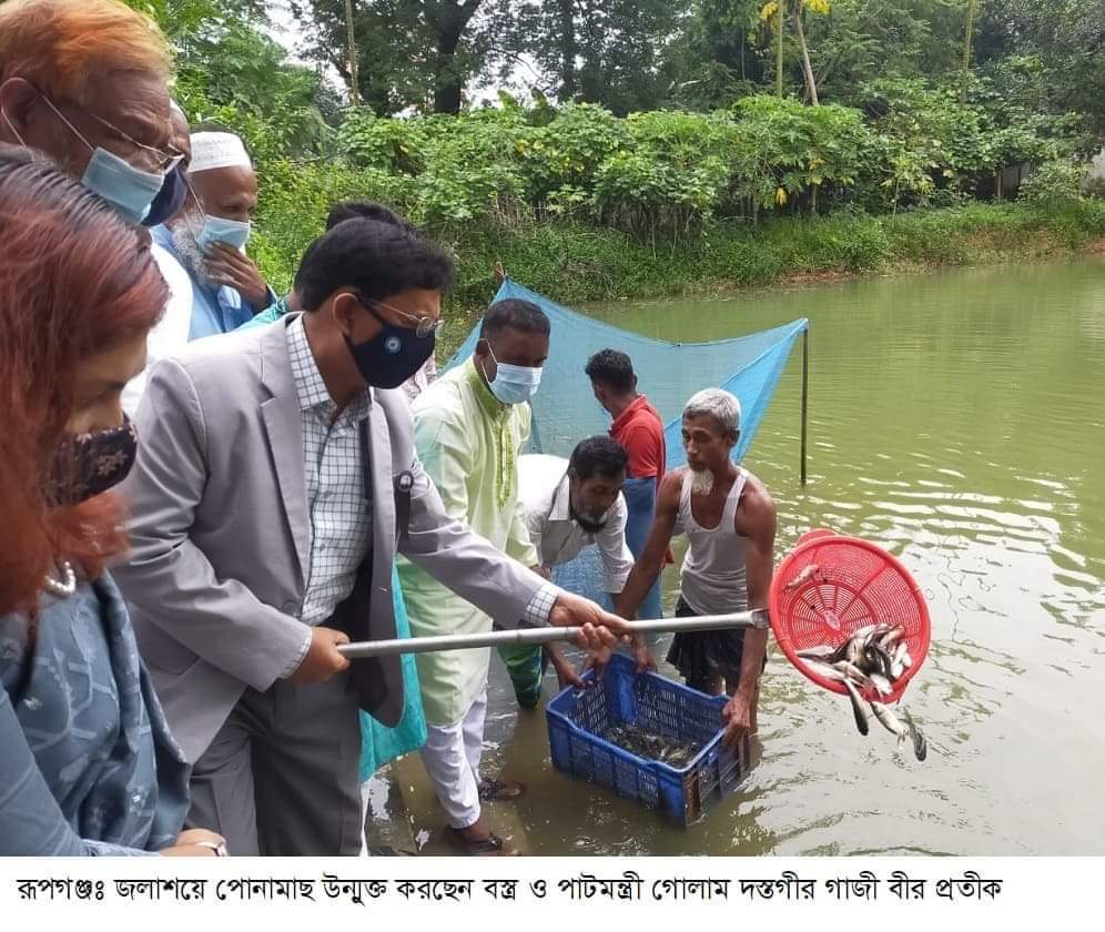 নারায়ণগঞ্জের রূপগঞ্জ উপজেলার পুকুর ও উন্মুক্ত জলাশায়ে পোনামাছ অবমুক্তকরণ এবং করোনাভাইরাসে ক্ষতিগ্রস্ত গরুর খামারীদের মধ্যে গো-খাদ্য বিতরণ কর্মসূচির উদ্বোধন করা হয়েছে। গতকাল ২৬ আগষ্ট বৃহস্পতিবার বস্ত্র ও পাটমন্ত্রী গোলাম দস্তগীর গাজী বীর প্রতীক এ কর্মসূচির উদ্বোধন করেন। ২০২১-২২ অর্থ বছরে মৎস অধিদপ্তরের রাজস্ব খাতের আওতায় পোনামাছ উন্মুক্তকরণ ও উপজেলা প্রশাসনের উদ্যোগে করোনাভাইরাসে ক্ষতিগ্রস্ত গরুর খামারীদের মধ্যে গো-খাদ্য বিতরণ করা হয়।