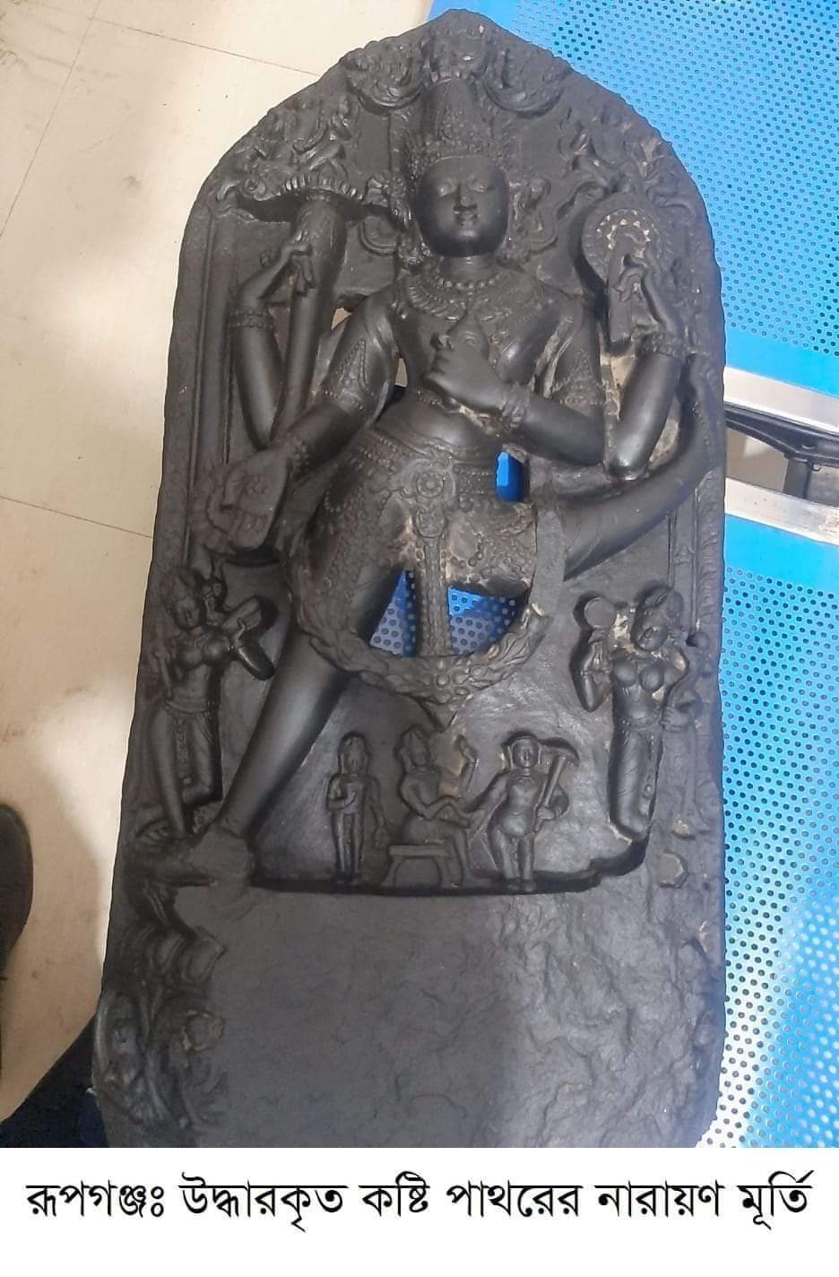 এশিয়ান হাইওয়ে সড়ক নামে পরিচিত ঢাকা বাইপাস সড়কের নারায়ণগঞ্জের রূপগঞ্জ উপজেলার কালাদী এলাকার মেসার্স এফ হক ফিলিং স্টেশনের সামনে থেকে গতকাল ৭ আগষ্ট শনিবার ভোর রাতে সাড়ে তিন কোটি টাকা মূল্যের কষ্টি পাথরের নারায়ণ মূর্তি উদ্ধার করেছে র্যাব-১ এর সদস্যরা। এসময় মুন্সিগঞ্জ জেলার টঙ্গিবাড়ি থানার মান্দ্রা এলাকার মৃত শুক্কুর আলীর ছেলে আব্দুল হালিম (৫৯), পশ্চিম আউটশাহী এলাকার মৃত বিশু মিয়ার ছেলে আব্দুল মালেক (৬৩) ও শিলিমপুর এলাকার মৃত আব্দুল খালেক সরকারের ছেলে আব্দুল মজিদকে (৫৩) গ্রেফতার করা হয়। তাদের কাছ থেকে তিনটি মোবাইল সেট উদ্ধার করা হয়।