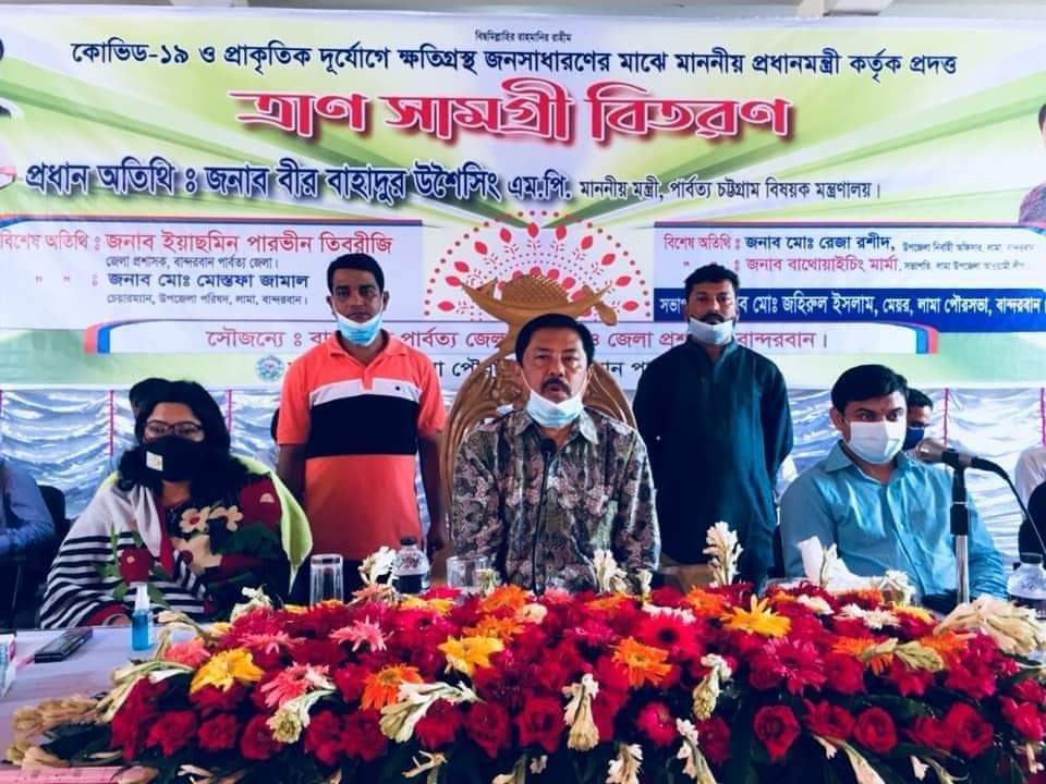 পার্বত্য চট্টগ্রাম বিষয়ক প্রতিমন্ত্রী বাবু বীর বাহাদুর উশৈসিং এমপি মহোদয়, বন্যা দুর্গতদের মাঝে দু'হাজার পরিবারকে জরুরী খাদ্য সামগ্রি ও ৯০ পরিবারকে আড়াই হাজার নগদ টাকা এবং বেশ কিছু ঢেউ টিন বিতরণ করেন।