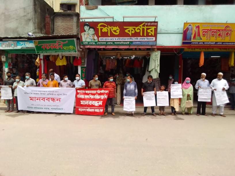 শনিবার (২১ আগস্ট) সকাল ১১টায় লালমনিরহাট জেলা শহরের বাটা মোড়ে সচেতন অভিভাবক সমাজ লালমনিরহাটের আয়োজনে জনগণের স্বাস্থ্য ব্যবস্থাকে শক্তিশালী করুন অবিলম্বে সকল শিক্ষা প্রতিষ্ঠান খুলে দিন দাবীতে মানববন্ধন অনুষ্ঠিত হয়।