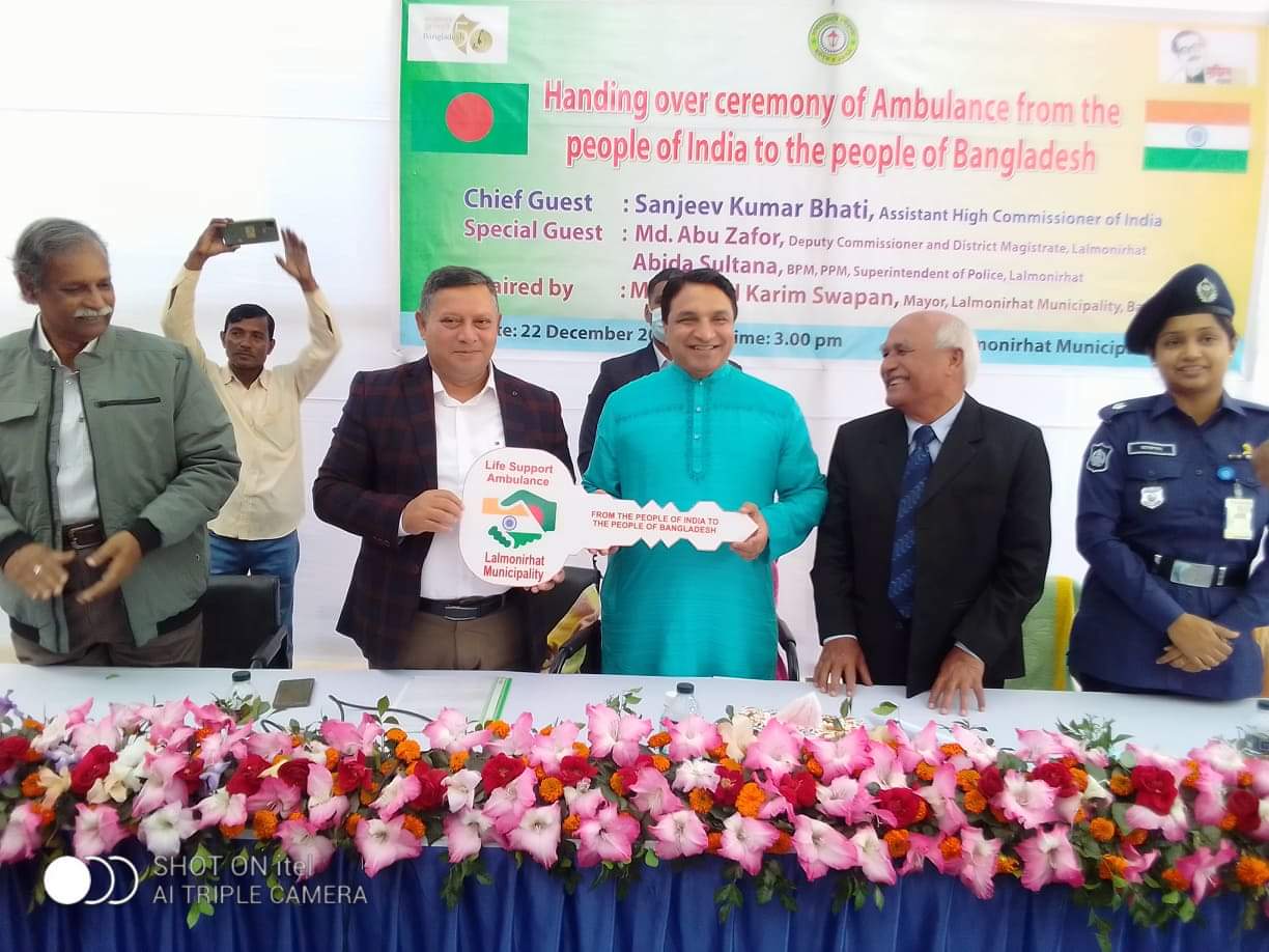 বুধবার (২২ ডিসেম্বর) বিকাল ২টা ৩০মিনিটে লালমনিরহাট পৌরসভা চত্ত্বরে লালমনিরহাট পৌরসভার আয়োজনে বঙ্গবন্ধুর জন্মশত বার্ষিকী ও স্বাধীনতার সুবর্ণ জয়ন্তী বিজয়ের ৫০ বছর উপলক্ষে বন্ধু প্রতীম ভারতীয় জনগণের পক্ষ থেকে বাংলাদেশের জনগণ তথা লালমনিরহাট পৌর নাগরিকবৃন্দের জরুরী স্বাস্থ্য সেবার মান উন্নয়নে 'আইসিইউ সম্বলিত এ্যাম্বুলেন্স' উপহারের চাবি হস্তান্তর অনুষ্ঠান অনুষ্ঠিত হয়।