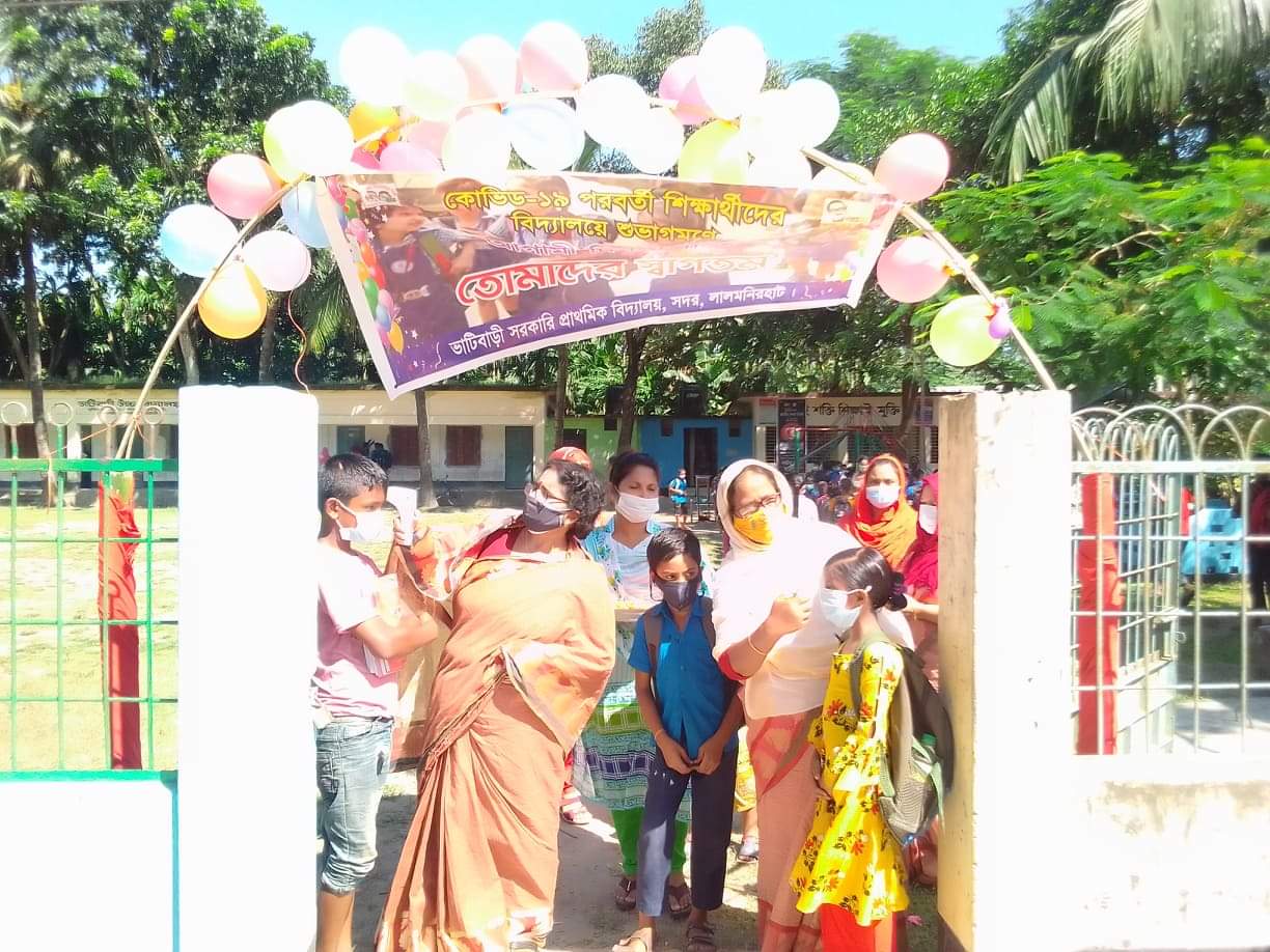 ভাটিবাড়ী সরকারি প্রাথমিক বিদ্যালয়ের গেটটি রঙ্গিন বেলুন ও ব্যানার দিয়ে সাজানো হয়। একে একে পঞ্চম শ্রেণিসহ তৃতীয় শ্রেণির ছাত্র-ছাত্রীরা মাস্ক পড়ে ভিতরে ঢুকলে তাদের প্রত্যেককে ফুল ছিটিয়ে বরণ করা হয়। সেই সাথে ইনফয়েট থার্মমিটার দিয়ে কোভিড-১৯ পরীক্ষা করা হয়। এরপর প্রত্যেক শিক্ষার্থীর হাত ধোয়া নিশ্চিত করে শ্রেণি কক্ষে প্রবেশ করানো হয়। প্রত্যেক ব্রেঞ্চে একজন করে জেট প্ল্যাণে বসানো হয়। এরপরই স্ব স্ব শিক্ষকগণ ক্লাস গ্রহণ করেন।