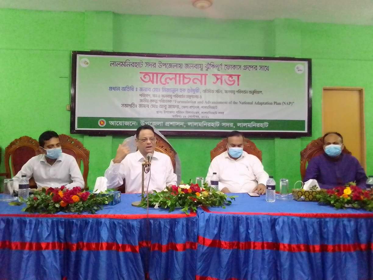 সভাপতিত্ব করেন লালমনিরহাট জেলা প্রশাসক আবু জাফর। প্রধান অতিথি ছিলেন জলবায়ু পরিবর্তন অনুবিভাগের অতিরিক্ত সচিব ও পরিবেশ, বন ও জলবায়ু পরিবর্তন মন্ত্রণালয়ের জাতীয় প্রকল্প পরিচালক মিজানুল হক চৌধুরী। বক্তব্য রাখেন লালমনিরহাট সদর উপজেলা পরিষদের মহিলা ভাইস চেয়ারম্যান লতিফা বেগম লাকী, লালমনিরহাট সদর উপজেলা নির্বাহী কর্মকর্তা (ভারপ্রাপ্ত) রুবেল রানা, লালমনিরহাট সদর উপজেলা পরিষদের চেয়ারম্যান কামরুজ্জামান সুজন প্রমুখ। এ সময় সাপ্তাহিক আলোর মনি পত্রিকার সম্পাদক মাসুদ রানা রাশেদসহ জলবায়ু ঝুঁকিপূর্ণ ফোকাস গ্রুপের সদস্যবৃন্দ উপস্থিত ছিলেন।