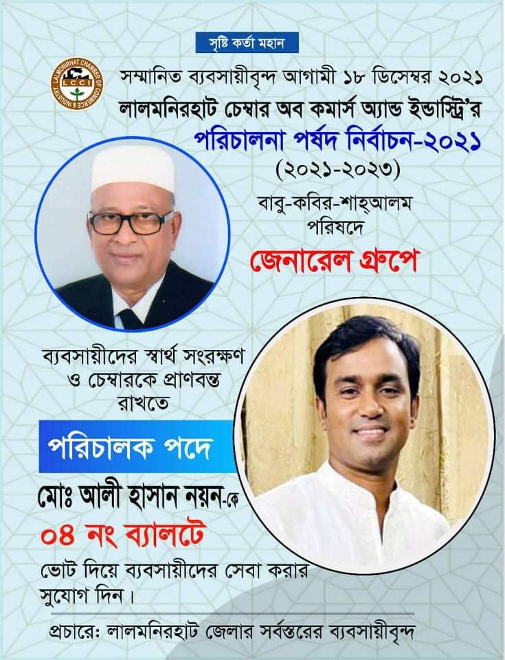 লালমনিরহাট চেম্বার অব কমার্স এন্ড ইন্ডাস্ট্রি'র পরিচালনা পর্ষদ নির্বাচন-২০২১ (২০২১-২০২৩) এ বাবু-কবির-শাহ্ আলম পরিষদে জেনারেল গ্রুপে পরিচালক পদপ্রার্থী সৎ, যোগ্য, নির্ভীক, নিঃস্বার্থ, সমাজ সেবক ও ক্রীড়ানুরাগী মোঃ আলী হাসান নয়ন-কে ০৪নং ব্যালটে ব্যবসায়ীদের স্বার্থ সংরক্ষণ ও চেম্বারকে প্রাণবন্ত রাখতে ভোট দিয়ে ব্যবসায়ীদের সেবা করার সুযোগ দিন।
