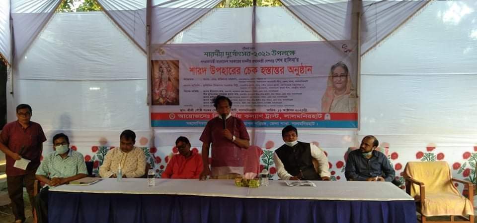 সোমবার (১১ অক্টোবর) বিকাল ৩টায় শ্রীশ্রী গৌরী শংকর গোশালা সোসাইটি লালমনিরহাট চত্ত্বরে হিন্দু ধর্মীয় কল্যাণ ট্রাস্ট লালমনিরহাটের আয়োজনে বাংলাদেশ পূজা উদযাপন পরিষদ লালমনিরহাট জেলা শাখার সহযোগিতায় শারদীয় দুর্গোৎসব-২০২১ উপলক্ষে গণপ্রজাতন্ত্রী বাংলাদেশ সরকারের মাননীয় প্রধানমন্ত্রী দেশরত্ন শেখ হাসিনা'র শারদ উপহারের চেক হস্তান্তর অনুষ্ঠান অনুষ্ঠিত হয়।