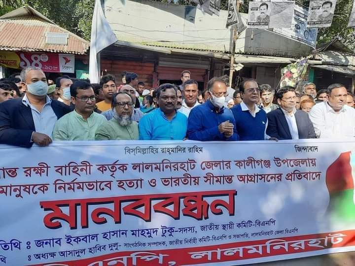 বৃহস্পতিবার (১৮ নভেম্বর) দুপুর ২টা ৩০মিনিটে লালমনিরহাট জেলার কালীগঞ্জ উপজেলার গোড়ল ইউনিয়নের বুড়িরহাট গ্রামের বলাইয়েরহাট বাজারের লালমনিরহাট জেলা বিএনপির আয়োজনে সীমান্ত হত্যার প্রতিবাদে মানববন্ধন অনুষ্ঠিত হয়।