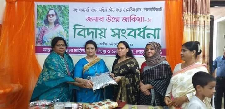 লালমনিরহাট জেলা মহিলা ক্রীড়া সংস্থা ও লেডিস ক্লাবের সভানেত্রী সাবিহা সুলতানা'র সভাপতিত্বে অনুষ্ঠিত বিদায় সংবর্ধনায় বক্তব্য রাখেন লালমনিরহাট জেলা মহিলা ক্রীড়া সংস্থার সহ-সভাপতি ফেরদৌসী বেগম বিউটি, লালমনিরহাট জেলা মহিলা ক্রীড়া সংস্থা ও লেডিস ক্লাবের সহ-সভানেত্রী জনাব উম্মে জাকিয়া প্রমুখ। এ সময় লালমনিরহাট জেলা মহিলা ক্রীড়া সংস্থা ও লেডিস ক্লাবের অন্যান্য নেত্রীবৃন্দ উপস্থিত ছিলেন।