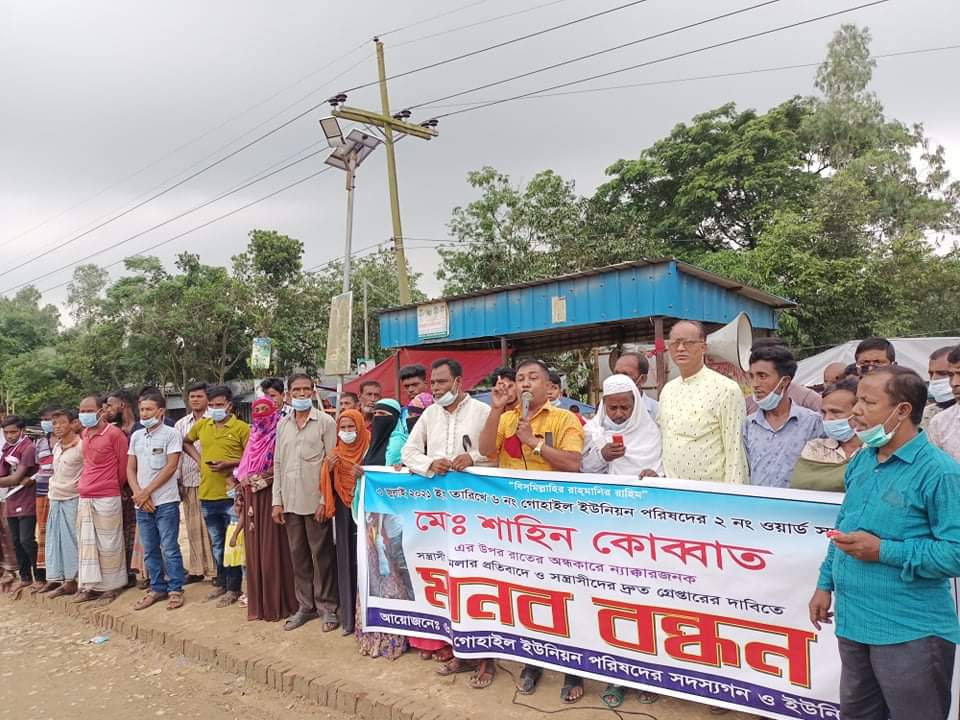 গোহাইল ইউনিয়ন আওয়ামী লীগের সিনিয়র সহ সভাপতি দীনেশ চন্দ্র পালের সভাপতিত্বে ও ছাত্রলীগ নেতা আবুল খায়ের শাহীনের সঞ্চালনায় মানববন্ধনে বক্তব্য রাখেন উপজেলা যুবলীগের ত্রাণ ও দুর্যোগ বিষয়ক সম্পাদক সবুজ সোনার, ওয়ার্ড আওয়ামী লীগের সভাপতি খয়বর আলী, ইউপি সদস্য তাজনুর রহমান শাহীন, আব্দুল করিম, এনামুল হক, খলিল মিয়া, ছাত্রলীগ নেতা শাহীন, স্বেচ্ছাসেবক লীগ নেতা আব্দুর রউফ, রুপিহার যুবসমাজ উন্নয়ন সংস্থার সভাপতি মজনু মিয়া, সমাজসেবক আব্দুল মান্নান, এমদাদুল হক, মোকছেদুল হক, মোক্তার হোসেন, অন্যন্যোর মধ্যে ইউপি সদস্যা মমতাজ বেগম সহ সন্ত্রাসী হামলার শিকার শাহিন কোব্বাতের পরিবারের সদস্যরাও উপস্থিত ছিলেন।