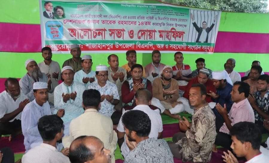 বগুড়ার শাজাহানপুরে বিএনপির ৪৩তম প্রতিষ্ঠা বার্ষিকী ও তারেক জিয়ার ১৪তম কারামুক্তি দিবস উপলক্ষে আলোচনা ও বিশেষ দোয়া মাহফিল অনুষ্ঠিত হয়েছে।