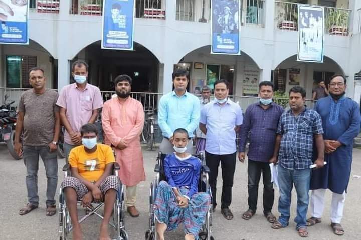 হুইল চেয়ার সহায়তা পেয়ে মাদলার জন্ম প্রতিবন্ধী শাকিল হোসেন ও দুর্ঘটনায় ক্ষতিগ্রস্ত প্রতিবন্ধী আজিজুলের মুখে আনন্দ উচ্ছাসে হাসি ফুটে উঠে।