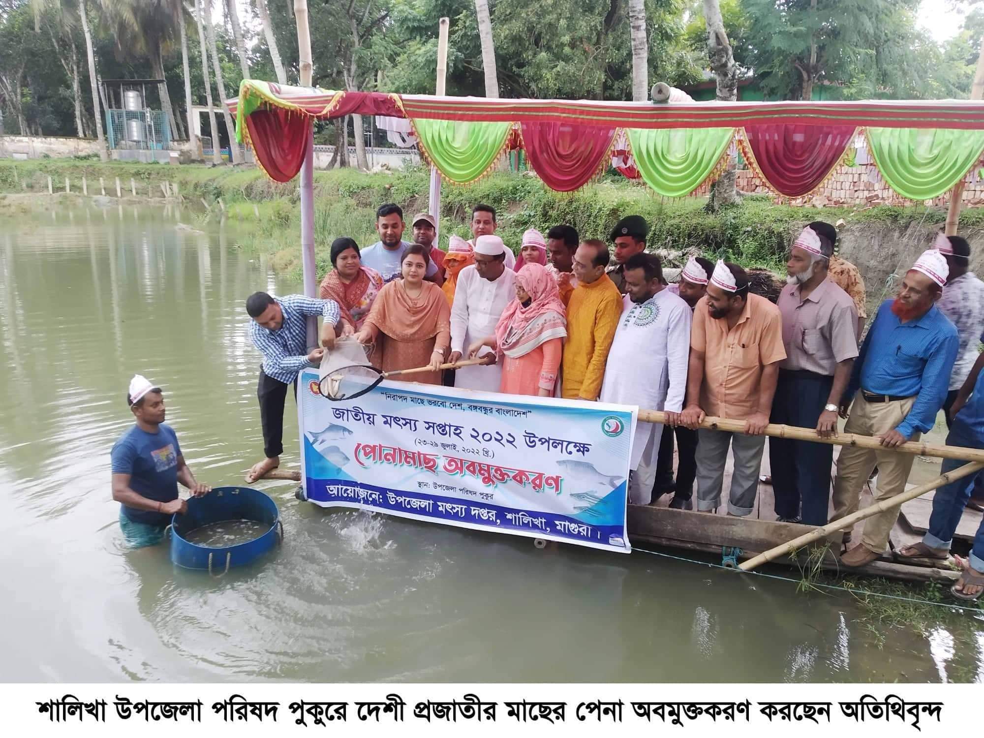 নিরাপদ মাছে ভরবো দেশ, বঙ্গবন্ধুর বাংলাদেশ এই প্রতিপাদ্যকে সামনে রেখে মাগুরার শালিখায় উপজেলা প্রশাসন ও উপজেলা মৎস্য দপ্তরের যৌথ আয়োজনে আলোচনা সভা, র্যালি পুরষ্কার বিতরনী ও মাছের পোনা অবমুক্তকরণসহ নানা কর্মসূচির মধ্য দিয়ে জাতীয় মৎস্য সপ্তাহ ২০২২ উদযাপিত হয়েছে। আজ রোববার সকাল ১০ টায় উপজেলা পরিষদ মিলনায়তন কক্ষে র্যালি পরবর্তী আলোচনা সভায় উপজেলা নির্বাহী কর্মকর্তা তারিফ-উল-হাসান এর সভাপতিত্বে প্রধান অথিতি ছিলেন মাগুরা- ২ আসনের সাংসদ ড. শ্রী বীরেন শিকদার, বিশেষ অতিথি ছিলেন শালিখা উপজেলা পরিষদের চেয়ারম্যান এ্যাড: কামাল হোসেন, উপজেলা সহকারী কমিশনার ভূমি উম্মে তহমিনা মিতু, উপজেলা আওয়ামীলীগের সভাপতি এ্যাড শ্যামল কুমার দে, সাধারণ সম্পাদক (ভারপ্রাপ্ত) ইলিয়াচুর রহমান, উপজেলা পরিষদের ভাইস চেয়ারম্যান রেজাউল ইসলাম, মহিলা ভাইস চেয়ারম্যান জেসমিন আক্তার সাবানা,শালিখা থানা অফিসার ইনচার্জ বিশারুল ইসলাম । অনুষ্ঠানে স্বাগত বক্তব্য রাখেন উপজেলা মৎস্য কর্মকর্তা শারমিন আক্তার। এছাড়াও উপজেলার বিভিন্ন দপ্তরের কর্মকর্তা, উপজেলার বিভিন্ন অঞ্চলের মৎস্য চাষী, মৎস্য ব্যবসায়ী প্রমূখ উপস্থিত ছিলেন । এ সময় বক্তারা বলেন, মৎস্য চাষ করে একদিকে যেমন সাবলম্বী হওয়া যায়, অপরদিকে প্রাণীজ আমিষের চাহিদা পূরনেও পরিপূক ভূমিকা রাখা যায়। তাই মৎস্য চাষ করে দেশ ও দশের কল্যানে নিজেদেরকে অংশ নেওয়ার উদ্যত আহবান জানান তারা। অনুষ্ঠান শেষে মৎস্য চাষে নারী উদ্যোক্তা হিসেবে উপজেলা মহিলা ভাইস চেয়ারম্যান জেসমিন আক্তার শাবানা, দেশীয় প্রজাতীর মাছ চাষে সফল হওয়ায় শংকর কর এবং বাহারি মাছ চাষে সফল হওয়ায় আব্দুল কাদের সর্দারকে পুরস্কার তুলে দেন অতিথিবৃন্দ।