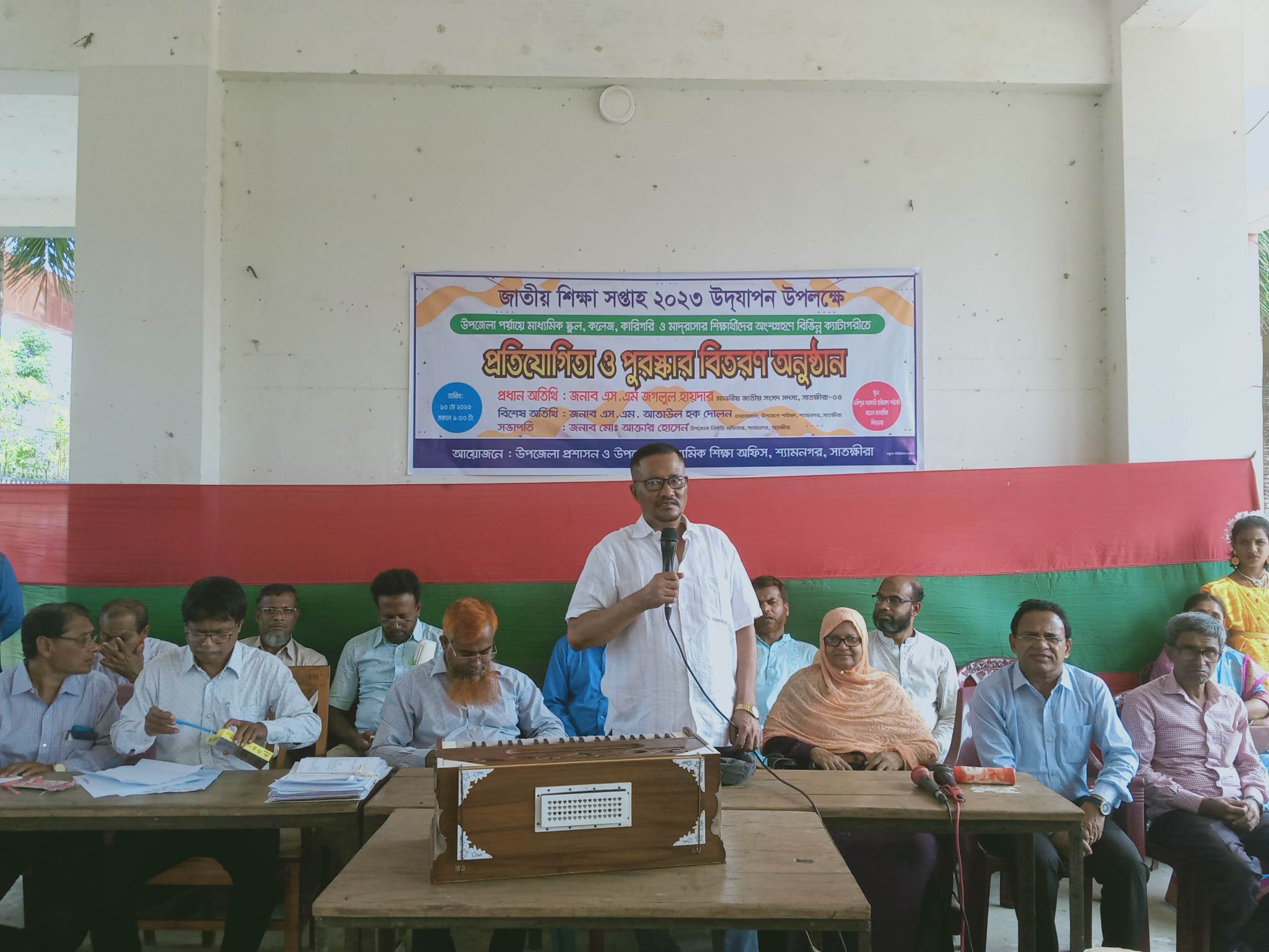 ছবি- শ্যামনগরে জাতীয় শিক্ষা সপ্তাহের প্রতিযোগিতার উদ্বোধনী অনুষ্ঠানে বক্তব্য রাখছেন উপজেলা মাধ্যমিক শিক্ষা অফিসার নূর মোহাম্মদ তেজারত।