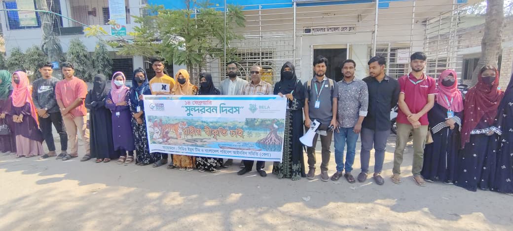 সাতক্ষীরার শ্যামনগর উপজেলায় শনিবার (১৪ ফেব্রুয়ারী) সকালে সিডিও ইয়ুথ টিম ও বাংলাদেশ পরিবেশ আইনবিদ সমিতির (বেলা) আয়োজনে প্রস্তাবিত সুন্দরবন দিবসকে রাষ্ট্রীয় স্বীকৃতির দাবীতে মানববন্ধন অনুষ্ঠিত হয়।