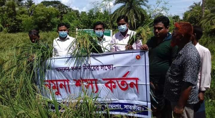 ছবি- শ্যামনগর কাশিমাড়ী ফসলের ফলন নির্ণয়ে নমুনা শস্য কর্তন অনুষ্ঠান।