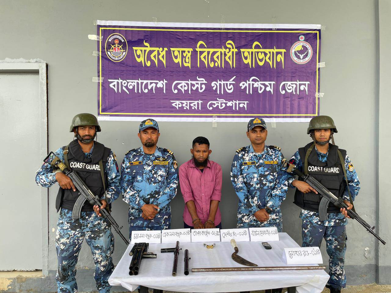 সাতীরা জেলার শ্যামনগর উপজেলায় ০২টি একনলা বন্দুক, ০১ টি চারনলা বন্দুক, ০২ রাউন্ড তাজা কার্তুজ ও দেশীয় অস্ত্রসহ ০১ জন ডাকাত সদস্যকে আটক করেছে কোস্ট গার্ড পশ্চিম জোন।