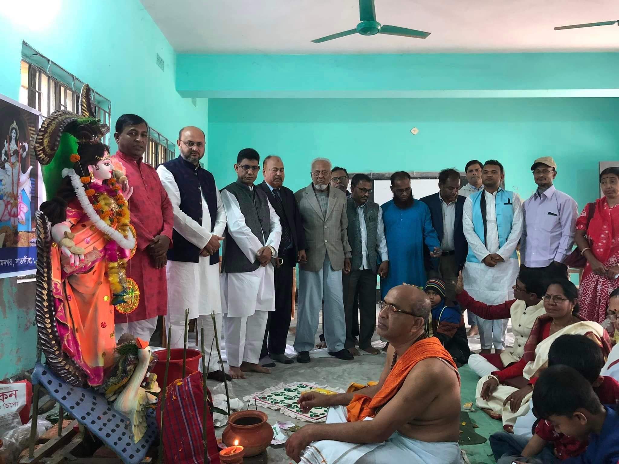 ছবি- শ্যামনগর আতরজান মহিলা কলেজ সরস্বতি পূজা মন্ডপে শুভেচ্ছা বিনিময়কালে উপজেলা চেয়ারম্যান এস এম আতাউল হক দোলন সহ অন্যান্য অতিথিবৃন্দ।