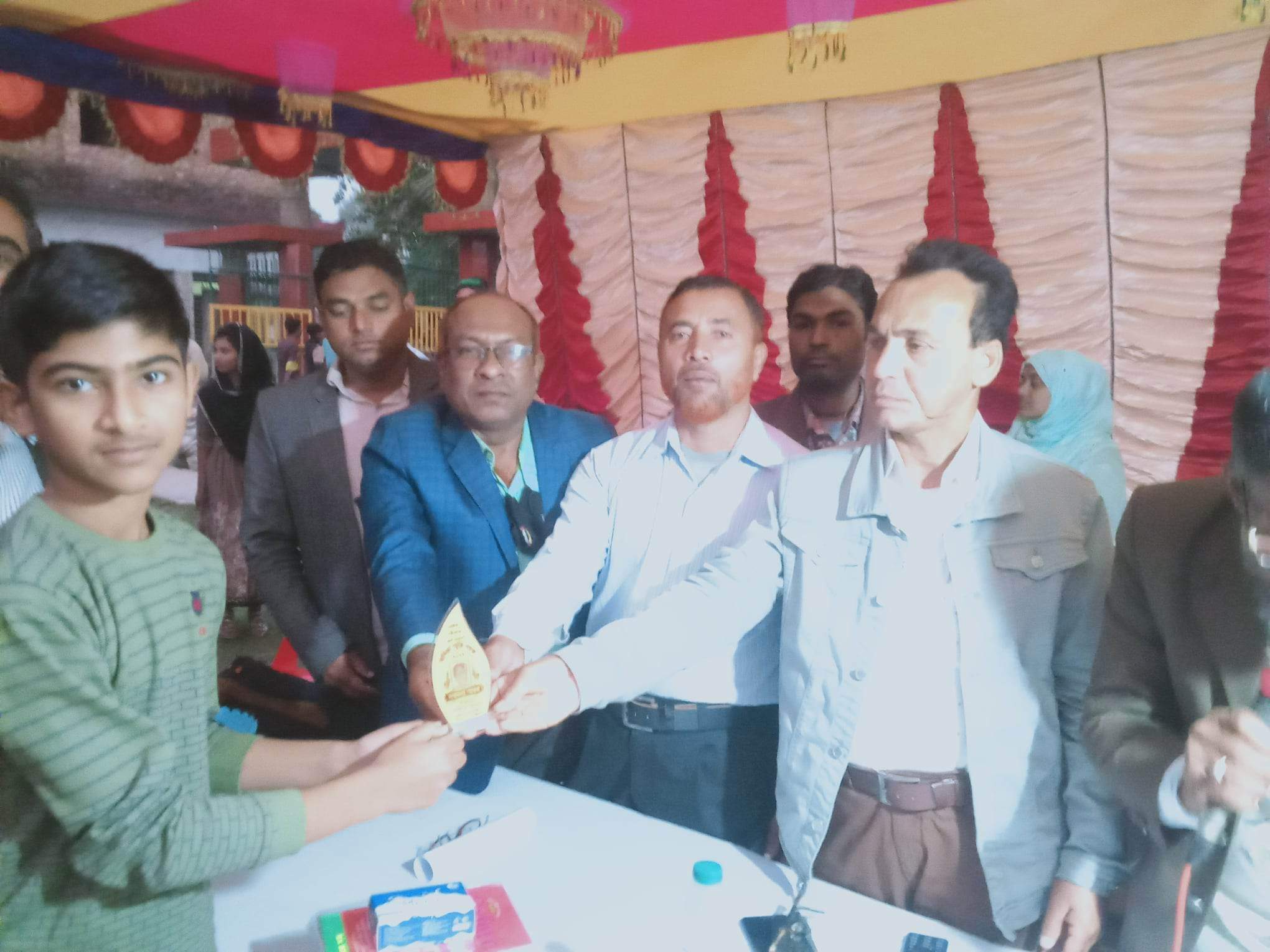 ছবি- শ্যামনগর ত্রিপানি বিদ্যাপীঠ মাধ্যমিক বিদ্যালয়ে বার্ষিক পরীক্ষায় সর্বোচ্চ নম্বরপ্রাপ্ত ছাত্রকে অম্বিকা স্মৃতি পদক প্রদান করছেন ইউপি চেয়ারম্যান অসীম কুমার মৃধা সহ অতিথিবৃন্দ।