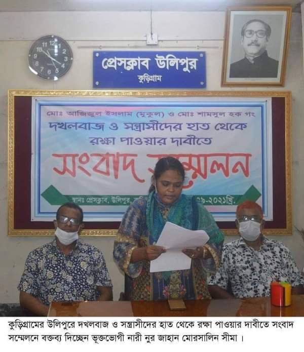 সংবাদ সম্মেলনের লিখিত বক্তব নুর জাহান মোরসালিন সীমা (৪৩) জানান, ২০১২ সালের ২৯ মে উপজেলার হাতিয়া ইউনিয়নের নতুন অন্তপুর গ্রামের মামা শ্বশুর আমিরুল ইসলাম চাঁদ ও মহিউল ইসলাম সাজুর কাছ থেকে তিনি ২৬ শতক জমি ক্রয় করেন। এরপর নিয়ম অনুযায়ী ওই জমি খারিজ করে নিজ নামে নেন। তারপর থেকে বসবাস করে আসছেন।