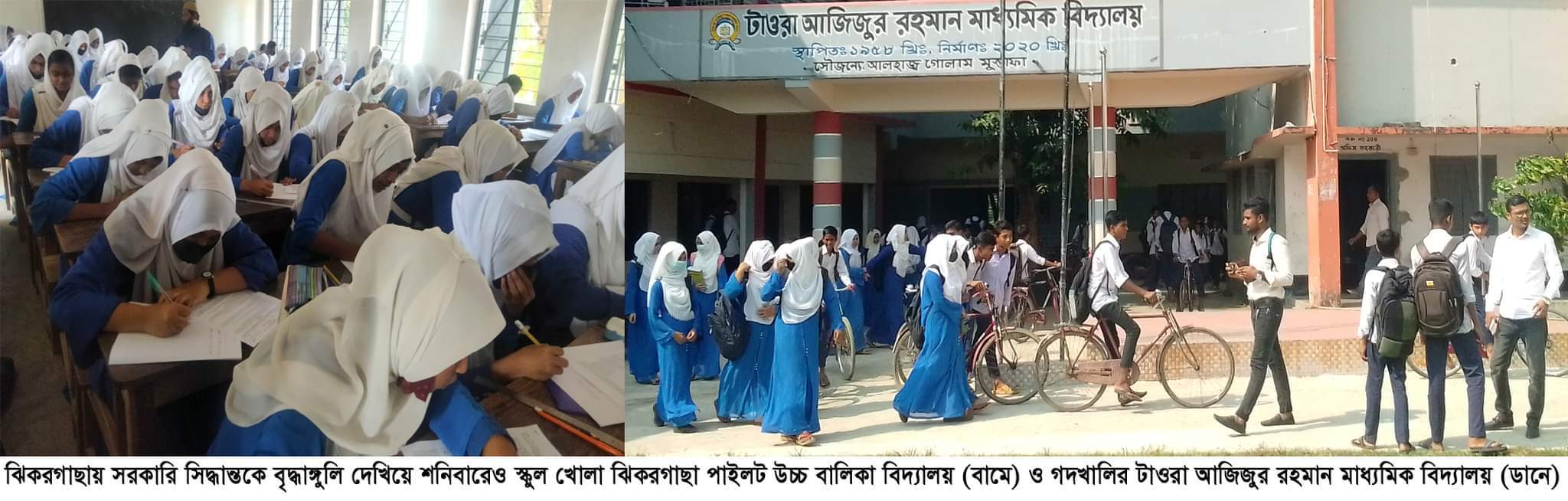 যশোরের ঝিকরগাছা উপজেলায় সরকারি সিদ্ধান্তকে বৃদ্ধাঙ্গুলি দেখিয়ে বন্ধের দিনে স্কুল খোলা রাখা হয়েছে। সম্প্রতি বিদ্যুৎ সাশ্রয়ের জন্য সকল শিক্ষা প্রতিষ্ঠান সপ্তাহে দুদিন বন্ধ রাখতে নির্দেশ দেয় শিক্ষা মন্ত্রণালয়। কিন্তু কয়েকটি শিক্ষা প্রতিষ্ঠান সেই নির্দেশনা না মেনে শুক্রবার শনিবার কোচিং এর নামে কোমলমতি শিশুদের স্কুলে আসতে বাধ্য করছে। সরজমিন পরিদর্শনে দেখা যায়, ৫/১১/২২ তারিখ (শনিবার) পৌরসদরের ঝিকরগাছা পাইলট উচ্চ বালিকা বিদ্যালয়, গদখালির টাওরা আজিজুর রহমান মাধ্যমিক বিদ্যালয় খোলা রাখা হয়েছে। পাইলট উচ্চ বালিকা বিদ্যালয়ে ৬ষ্ঠ শ্রেণি এবং ৭ম শ্রেণির শিক্ষার্থীদের পরীক্ষা নেওয়া হচ্ছে। গতকাল শুক্রবারও এই স্কুলে বাচ্চাদের পরীক্ষা নেওয়া হয়েছে। স্কুলের প্রধান শিক্ষক জনাব আহাছান উদ্দীন বলেন, এস এস সি পরীক্ষার সময় স্কুল বন্ধ থাকায় শিক্ষার্থীদের ক্ষতি পুষিয়ে নিতে এই উদ্যোগ নেওয়া হয়েছে। সরকারি নির্দেশনা অমান্য হচ্ছে কিনা এই প্রশ্নের উত্তরে তিনি বলেন, ম্যানেজিং কমিটির সাথে বলে এই ক্লাস নেওয়া হচ্ছে। লিখিত রেজুলেশন আছে কিনা জানতে চাইলে তিনি সেটা দেখাতে পারেননি। গদখালি টাওরা আজিজুর রহমান মাধ্যমিক বিদ্যালয়ে শনিবার সকাল ১১ টায় গিয়ে দেখা যায় ৬ষ্ঠ থেকে ১০ম শ্রেণির সকল শিক্ষার্থী স্কুল ড্রেস পরে ক্লাস করছে। কয়েকজন শিক্ষার্থী অভিযোগ করে বলেন, প্রতি সপ্তাহে এভাবে আমাদেরকে স্কুলে আসতে বাধ্য করা হয়। না আসলে স্যারেরা খুব বকাবকি করে। আমরা ছুটির দিনে ছুটি চাই। স্কুলের প্রধান শিক্ষক জনাব আব্দুল মান্নান বলেন, সরকারি নির্দেশনা না মানা ভুল হয়েছে। আগামী দিনগুলোতে বন্ধের দিন আর স্কুল খোলা রাখা হবেনা। বন্ধের দিনে স্কুল খোলার বিষয়ে জানতে চাইলে ঝিকরগাছা উপজেলা মাধ্যমিক শিক্ষা কর্মকর্তা জনাব কামরুজ্জামান কবীর বলেন, ঐসব স্কুলে শিক্ষার্থীদের ভালোর জন্যই ক্লাস করানো হচ্ছে। এটা একটা ভালো উদ্যোগ। বিদ্যুৎ সাশ্রয়ে সরকারের দুদিন স্কুল বন্ধ রাখার সিদ্ধান্ত তাহলে ভুল হয়েছে কিনা এ প্রশ্নের জবাবে তিনি বলেন, বিদ্যুৎ সাশ্রয়ের কথা যদি বলেন তাহলে স্কুল সপ্তাহে সাতদিন বন্ধ রাখলেই ভালো হয়। ঝিকরগাছা উপজেলা নির্বাহী কর্মকর্তা বলেন, বন্ধের দিনে স্কুল খোলা রাখার বিষয়টি আমার জানা নেই। আমাদের সকলের আইনের প্রতি শ্রদ্ধাশীল হওয়া উচিত। এদিকে ছুটির দিনে স্কুল রাখায় অভিভাবক এবং শিক্ষকরাও অসন্তোষ প্রকাশ করেছেন।
