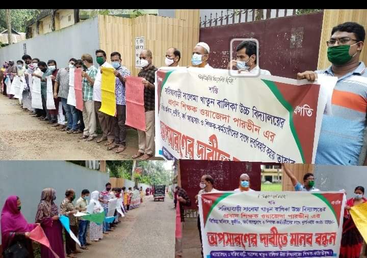 জামালপুরের সরিষাবাড়ী সালেমা খাতুন বালিকা উচ্চ বিদ্যালয়ের প্রধান শিক্ষক ওয়াজেদা পারভীন এর বিরুদ্ধে অনিয়ম, দূর্নীতি, অর্থ আত্নসাৎ, শিক্ষক-কর্মচারী ও অভিভাবকদের সাথে খারাপ ব্যবহারের অভিযোগ এনে তার অপসারনের দাবীতে মানববন্ধন কর্মসূচী পালন করা হয়েছে।