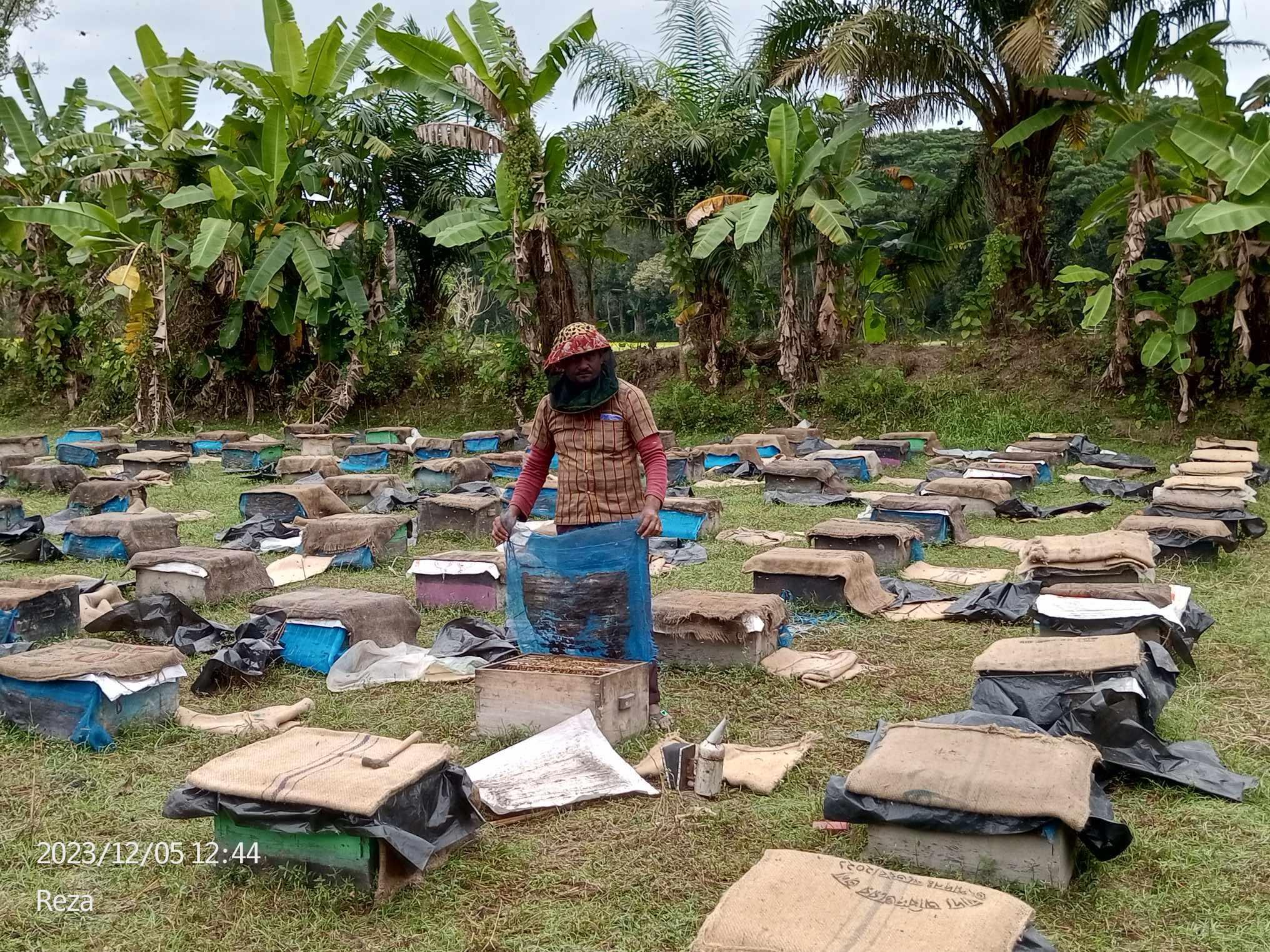 তিনজন মৌয়াল মুখে প্রোটেকশন ব্যবহার করে এক বাক্স থেকে আরেক বাক্স মধু সংগ্রহ করছে। মধু সংগ্রহকারী তিনজন হচ্ছেন মোঃ আব্দুস সাত্তার, মোঃ আল আমিন এবং মোঃ শফিকুল ইসলাম । আজ দুপুরের পর মৌয়ালেরা মধু সংগ্রহের উদ্দেশ্যে সিরাজগঞ্জ রওনা দিবেন।