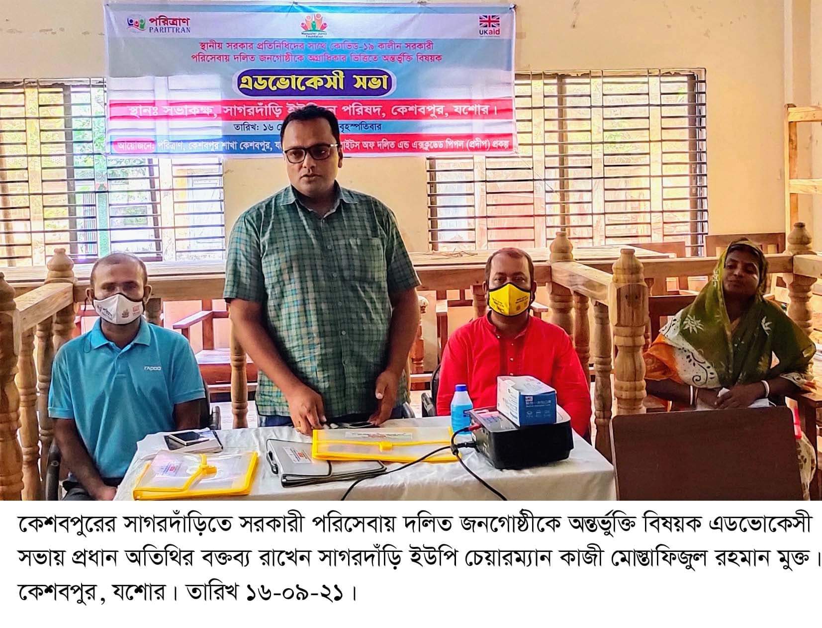সাগরদাঁড়ি ইউনিয়ন দলিত পরিষদের সহ-সভাপতি বাসন্তি রানী দাসের সভাপতিত্বে প্রধান অতিথির বক্তব্য রাখেন সাগরদাঁড়ি ইউনিয়ন পরিষদের চেয়ারম্যান কাজী মোস্তাফিজুল রহমান মুক্ত। বিশেষ অতিথির বক্তব্য রাখেন কেশবপুর উপজেলা প্রেসক্লাবের সভাপতি এস আর সাঈদ, উপজেলা দলিত পরিষদেও সভাপতি সুজন দাস, প্রভাষক কানাই লাল ভট্টাচার্য ও প্রভাষক কুন্তল বিশ^াস। বক্তব্য রাখেন ইউপি সদস্য আব্দুস সবুর, কাজী মহব্বত আলী, জালাল উদ্দীন, আনোয়ারা, মনোয়ারা বেগম, কবিতা খাতুন, পুষ্প রানী দাস, যাদব দাস প্রমুখ। এডভোকেসী সভায় পাওয়ার পয়েন্ট প্রেজেন্টেশন উপস্থাপন ও সঞ্চালনা করেন পরিত্রাণ প্রদীপ প্রকল্পের সমন্বয়কারী রবিউল ইসলাম, শরিফ আহমেদ ও সাহিদা খাতুন।এডভোকেসী সভায় কোভিড কালীন সময়ে সরকারী বিভিন্ন পরিষেবায় দলিত জনগোষ্ঠীকে অগ্রাধিকার ভিত্তিতে অন্তর্ভুক্তি, ইউনিয়ন পরিষদের স্ট্যান্ডিং ও ঐচ্ছিক কমিটিতে দলিতদের প্রতিনিধি অন্তর্ভুক্তি, সরকারী বিভিন্ন সামাজিক নিরাপত্তা বেস্টনী কর্মসূচীতে দলিতদের অগ্রাধিকার, গৃহহীন প্রকল্পের ঘর বিতরনে দলিতদের অগ্রাধিকার, কৃষি ও অকৃষি খাস জমি বন্দবস্তের ক্ষেত্রে দলিত ভমিহীনদের অগ্রাধিকার, ইউনিয়ন পরিষদের ২০২১-২০২২ অর্থবছরের বাজেটে দলিতদের জন্য বরাদ্দকৃত বাজেট দলিত শিক্ষার্থীদের উচ্চ শিক্ষায় সহায়তা প্রদান ও নারীদের দক্ষতা উন্নয়নে ব্যয়ের জন্য জোর দাবী জানান।