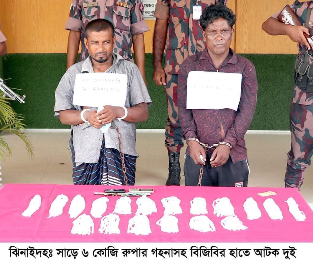 ঝিনাইদহের মহেশপুর ৫৮ বিজিবির অভিযানে সাড়ে ৬ কেজি রুপার গহনাসহ দুই চোরাকারবারীকে আটক করেছে বিজিবি। সোমবার রাতে চুয়াডাংগা জেলার জীবননগর উপজেলার বিওপির সামনে থেকে যমুনা ডিলাক্স নামে একটি পরিবনে তল্লাসী চালিয়ে এই রুপা উদ্ধার করা হয়। এ সময় চোরাকারবারীর সঙ্গে জড়িত থাকার অভিযোগে জীবননগরের মেদেনীপুর গ্রামের সুলতানের ছেলে মোঃ আনন্দ (৫০) ও মহেশপুরের তৈলটুপি গ্রামের ফজল করীমের ছেলে মোঃ আব্বাস আলী (৪০) আটক করা হয়। বিজিবির হাবিলদার শহর আলী এই অভিযানের নেতৃত্ব দেন। মহেশপুর ৫৮ বিজিবির সহকারী পরিচালক মোঃ নজরুল ইসলাম খান জানান, ৬টি পলিথিন প্যাকেটে রুপার গহনা গুলো দুই পায়ের রান ও কোমরে বাধা ছিল। অভিযানে ৬ কেজি ৬৫৮ গ্রহ রুপা ছাড়াও ১টি মোবাইল ও বাংলাদেশী নগদ ২,৪০৪/- টাকা জব্দ করা হয়।