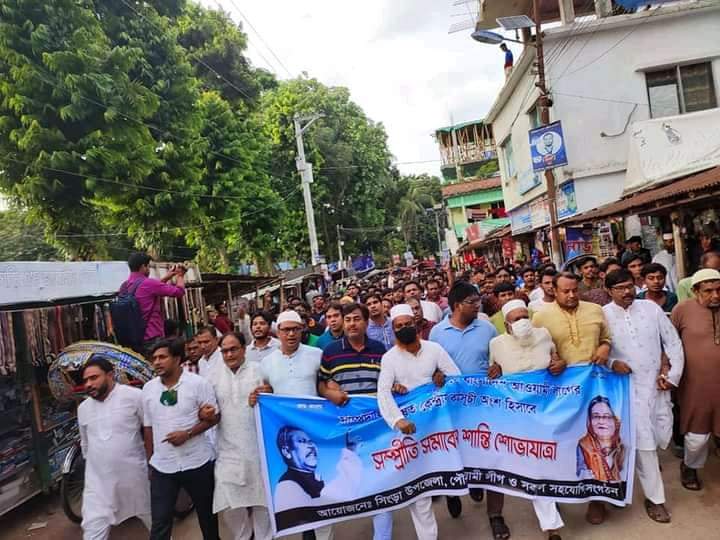 সারাদেশে সাম্প্রদায়িক সন্ত্রাসের প্রতিবাদে শান্তি সমাবেশ ও শোভাযাত্রা করেছে সিংড়া উপজেলা আওয়ামী লীগ ও অঙ্গসংগঠন। মঙ্গলবার বিকেল সাড়ে ৪ টায় উপজেলা আওয়ামী লীগের কার্যালয় থেকে শান্তি মিছিল শহরের প্রধান প্রধান সড়ক প্রদক্ষিণ করে সিংড়া বাসস্ট্যান্ডে শান্তি সমাবেশে অংশ নেয়।