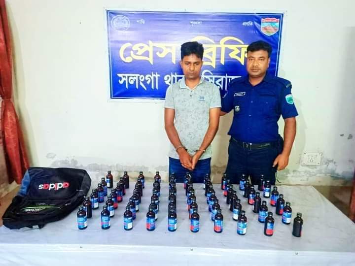সলঙ্গা থানা পুলিশের একটি আভিযানিক দল গত ২০/১০/২০২১ খ্রিঃ তারিখ বিকাল ১৬.০৫ ঘটিকার সময় সলংগা থানাধীন হাটিকুমরুল গোলচত্ত্বর সংলগ্ন বগুড়া রোডে মা-বাবার দোয়া হোটেলের সামনে ঢাকাগামী মহাসড়কের উপর অস্থায়ী পুলিশ চেকপোর্ষ্ট স্থাপন করে নওগাঁ হতে ঢাকাগামী যাত্রাবাড়ী বাস একতা পরিবহন এর যাত্রী আসামী ১। মোঃ হেলাল (২৮), পিতা-মোঃ মতিয়ার রহমান, সাং-গুপ্তা মানিক, থানা-শিবগঞ্জ, জেলা-চাঁপাইনবাবগঞ্জ-কে আমদানি নিষিদ্ধ ভারতীয় ৬০ বোতল ভারতীয় ফেন্সিডিল সহ গ্রেফতার করে।