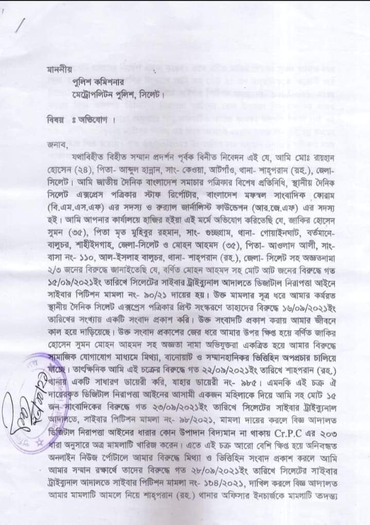 বাংলাদের সুনামধন্য জাতীয় দৈনিক বাংলাদেশ সমাচার পত্রিকার বিশেষ প্রতিনিধি, সিলেটের বহুল প্রচারিত দৈনিক সিলেট এক্সপ্রেস পত্রিকার স্টাফ রিপোর্টার, বাংলাদেশের সবচেয়ে শক্তিশালী সাংবাদিক সংগঠন বাংলাদেশ মফস্বল সাংবাদিক ফোরাম (বি.এম.এস.এফ) ও রুর্যাল জার্নালিস্ট ফাউন্ডেশন (আর.জে.এফ) এর সদস্য সংবাদকর্মী মোঃ রায়হান হোসেন নিজের নিরাপত্তার জন্য বাদি হয়ে ২ জন কথিত সাংবাদিককে অভিযুক্ত করে ২৩ অক্টোবর (শনিবার) সিলেটের মেট্রোপলিটন পুলিশ কমিশনার বরাবর একটি লিখিত অভিযোগ দায়ের করেন।