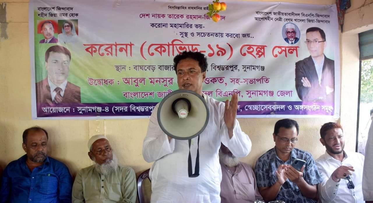 সুনামগঞ্জ জেলা বিএনপির উদ্যোগে করোনা (কোভিড-১৯) হেল্প সেল এর শুভ উদ্ভোধন করা হয়েছে। শনিবার দিন ব্যাপী চলছে বিশ্বম্ভরপুর উপজেলার সলুকাবাদ ও ধনপুর ইউনিয়নে বাংলাদেশ জাতীয়তাবাদী দল বিএনপির নেতাকর্মীদের আয়োজনে বাঘবের ও ধনপুর বাজারে করোনা প্রতিরোধে মাস্ক,সাবানও হেন্ডওয়াশ স্বাস্থ্য উপকরণ সামগ্রী বিতরনের কার্যক্রম।