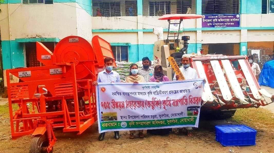 নোয়াখালী সুবর্ণচরে কৃষি সম্প্রসারণ অধিদপ্তরের বাস্তবায়নে কৃষি যান্ত্রীকরণ প্রকল্পের আওতায় ৭০% ভর্তুকি মূল্যে কৃষকদের মাঝে কৃষি যন্ত্রপাতি বিতরণ অনুষ্ঠিত হয়েছে।