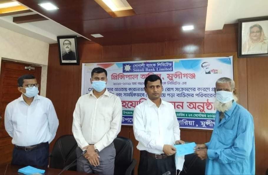 মুন্সিগঞ্জের গজারিয়া উপজেলা সোনালী ব্যাংক লিমিটেড দেশে চলমান করোনা ভাইরাস সংকট মোকাবেলায় কর্পোরেট সামাজিক দায়বদ্ধতা (CSR) কার্যক্রমের আওতায় মুন্সীগঞ্জ জেলার গজারিয়া উপজেলার কর্মহীন মানুষের জীবিকা নির্বাহে নিত্য প্রয়োজনীয় খাদ্য সামগ্রী ও স্বাস্থ্য সুরক্ষা সামগ্রী সহ চিকিৎসা ব্যয় নির্বাহের জন্য আর্থিক সহায়তা প্রদান করে। সোমবার উপজেলা পরিষদের সম্মেলন কক্ষে সকাল ১১টায়