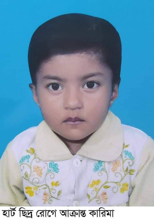 চার বছরের শিশু কণ্যা কারিমা।তার বাবা গােলাম রসুল একজন হতদরীদ্র ভ্যান চালক। মা ফজিলা বেগম মানুষের বাড়িতে গৃহপরিচারিকার কাজ করে সংসার চালান। খুলনার ডুমুরিয়া উপজেলার সাহস ইউনিয়নের বাগদাড়ি গ্রামে কারিমা নামের এই শিশুটির হার্ট ছিদ্র হয়ে এখন জীবন-মত্যুর সন্ধিক্ষণে। তার চােখে-মুখে শুধু বাঁচার আকুতি।
