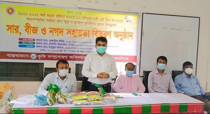 ময়মনসিংহের হালুয়াঘাটে ২০২১-২০২২ মৌসুমে পুনর্বাসন কর্মসূচির আওতায় গ্রীষ্মকালীন পেঁয়াজ বীজ ও নাবী পাট বীজ উৎপাদনে স্বয়ংসম্পূর্ণতা অর্জনের জন্য ক্ষুদ্র ও প্রান্তিক কৃষকদের মাঝে বিনামূল্যে সার, বীজ ও নগদ সহায়তা প্রদান করা হয়েছে। (০৯ সেপ্টেম্বর ২০২১)ইং বৃহস্পতিবার সকালে উপজেলা কৃষি সম্প্রসারণ অধিদপ্তরের আয়োজনে উপজেলা কৃষি অফিসের হলরুমে সার, বীজ ও নগদ সহায়তা প্রদান অনুষ্ঠিত হয়। উক্ত সার, বীজ ও নগদ সহায়তা প্রদান অনুষ্ঠানে উপজেলা কৃষি অফিসার মোঃ মাসুদুর রহমানের
