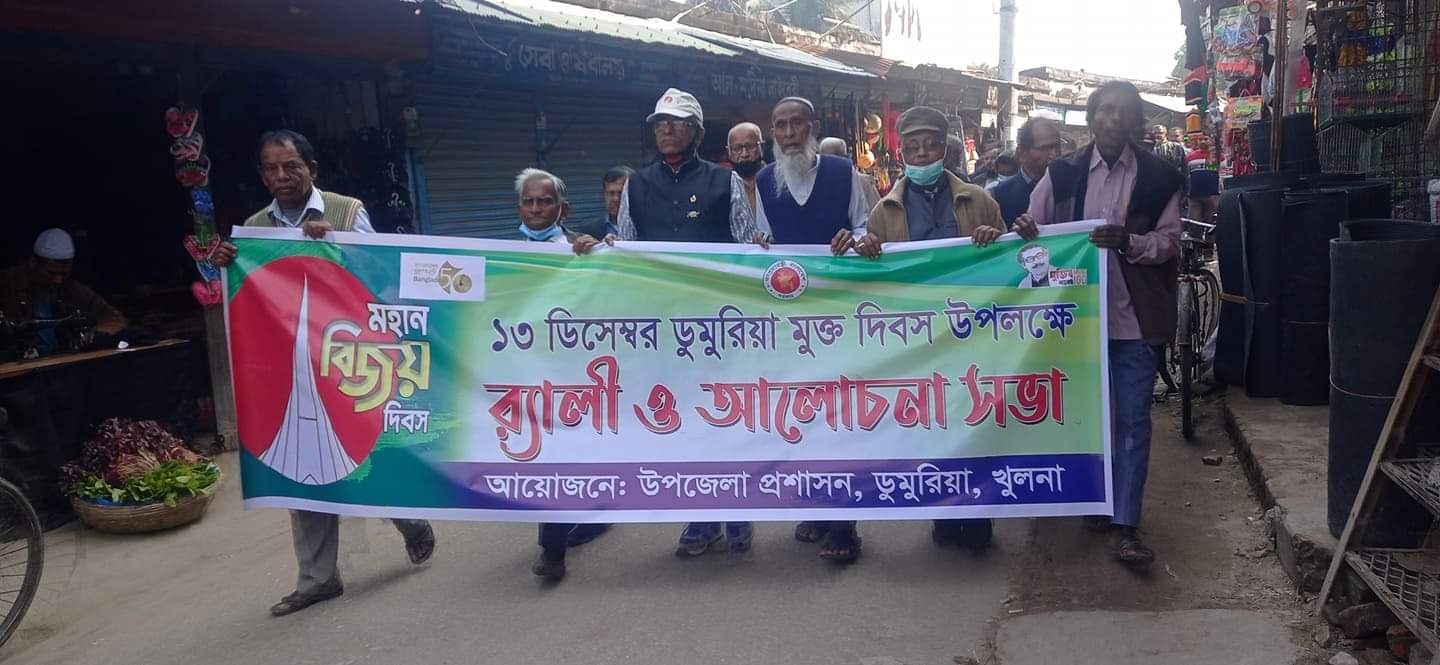 ১৩ ডিসেম্বর ডুমুরিয়া পাক হানাদার মুক্ত দিবস পালিত হয়েছে। ১৯৭১ সালে মুক্তিযুদ্ধ চলাকালে ডিসেম্বর মাস থেকেই দেশের বিভিন্ন অঞ্চল শত্রুমুক্ত হয়। তারই ধারাবাহিকতায় খুলনা জেলার ডুমুরিয়া উপজেলা শত্রুমুক্ত ঘোষণা করা হয় এই দিনে।দিবসটি উপলক্ষ্যে গতকাল সকালে খুলনার ডুমুরিয়া উপজেলা মুক্তিযোদ্ধা কমান্ড কাউন্সিল মুক্তিযোদ্ধা সংসদ ভবনে জাতীয় পতাকা উত্তোলন, জাতির পিতা বঙ্গবন্ধু শেখ মুজিবুর রহমান এবং শহীদ স্মৃতি সৌধে পুষ্পমাল্য অর্পণ করে শ্রদ্ধা নিবেদন করে প্রধান সড়কগুলোতে র্যালি প্রদর্শনী শেষে উক্ত অনুষ্ঠানে সভাপতিত্ব করেন ডুমুরিয়া বীর মুক্তিযোদ্ধা কমান্ডার নুরুল ইসলাম মানিক, প্রধান অতিথি ছিলেন ডুমুরিয়া উপজেলা পরিষদের চেয়ারম্যান গাজী এজাজ আহমেদ, বিশেষ অতিথি ছিলেন উপজেলা নির্বাহি অফিসার আব্দুল ওয়াদুদ, উপজেলা পরিষদের মহিলা ভাইস চেয়ারম্যান শারমিন পারভীন রুমা,