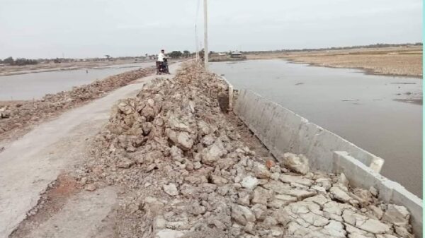সড়ক সংস্কারে অনিয়মের অভিযোগ কয়রায় সড়ক নির্মাণকাজের শুরুতেই হেলে পড়েছে গাইডওয়াল।
