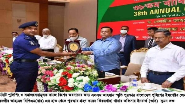 কমিউনিটি পুলিশিং ও সমাজসেবামূলক কাজে বিশেষ অবদানে এসএম আহসান স্মৃতি পুরস্কার ঝিকরগাছার ওসি সুমন ভক্ত।