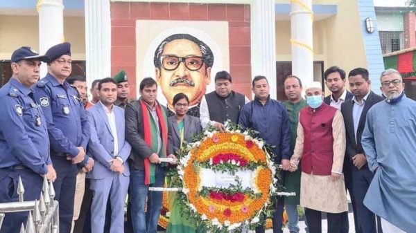 স্বাধীনতার সুবর্ণজয়ন্তীতে বঙ্গবন্ধুর প্রতিকৃতিতে বিশ্বনাথে উপজেলা পরিষদের শ্রদ্ধাঞ্জলি।