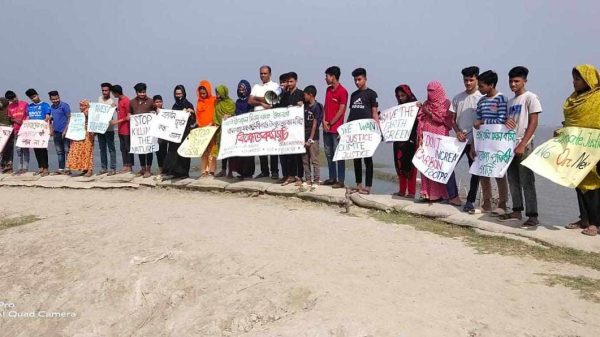 শ্যামনগরে জলবায়ু সংকটে বিপর্যস্ত উপকূল সুরক্ষার দাবিতে বিক্ষোভ।