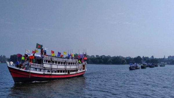 কাপ্তাই হ্রদের পানি দূষণমুক্ত রাখতে নৌকা প্রচারভিযান।