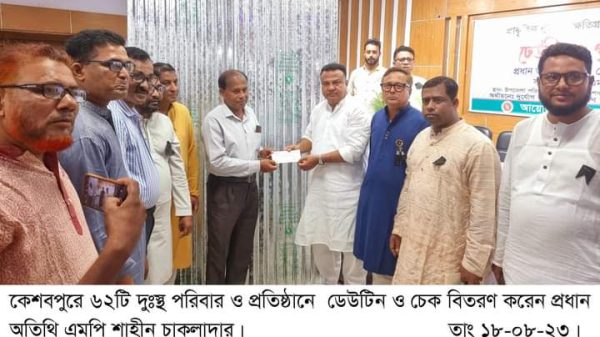 কেশবপুরে ৬২টি দুঃস্থ পরিবার ও প্রতিষ্ঠানে ডেউটিন ও চেক বিতরণ করলেন এমপি শাহীন চাকলাদার।