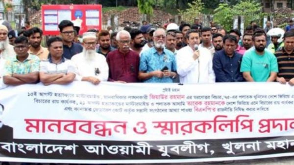 সাংবাদিক শাওন ও মনি’র উপর সন্ত্রাসী হামলার প্রতিবাদে কয়রায় মানববন্ধন।