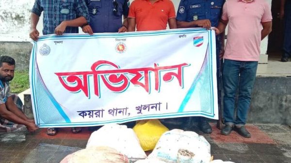 কয়রায় পুলিশের অভিযানে ১৩০ কেজি অবৈধ চিংড়ি মাছ জব্দ।